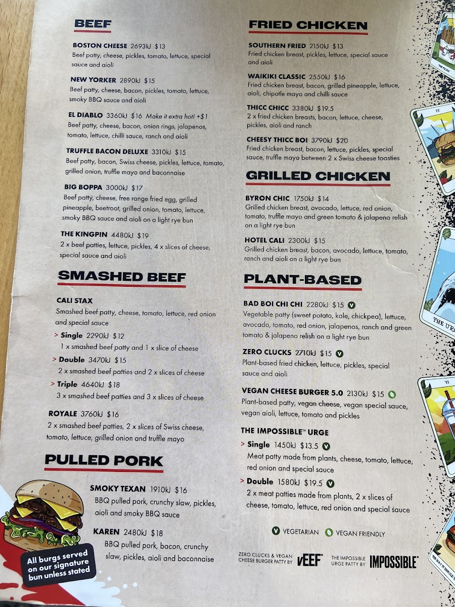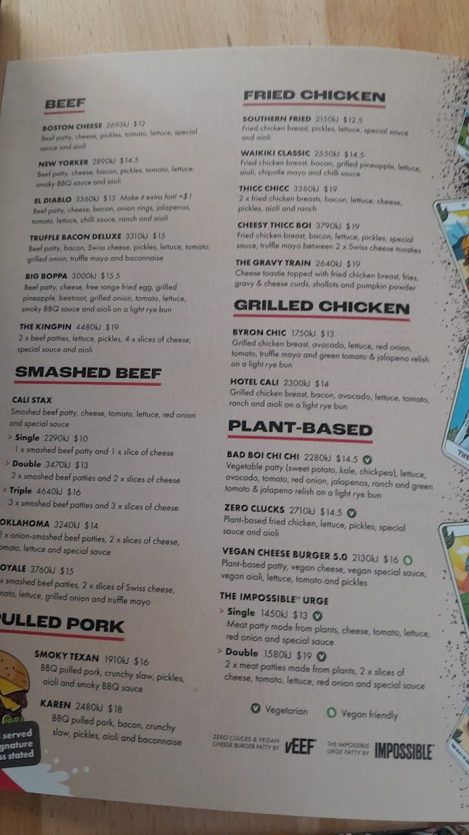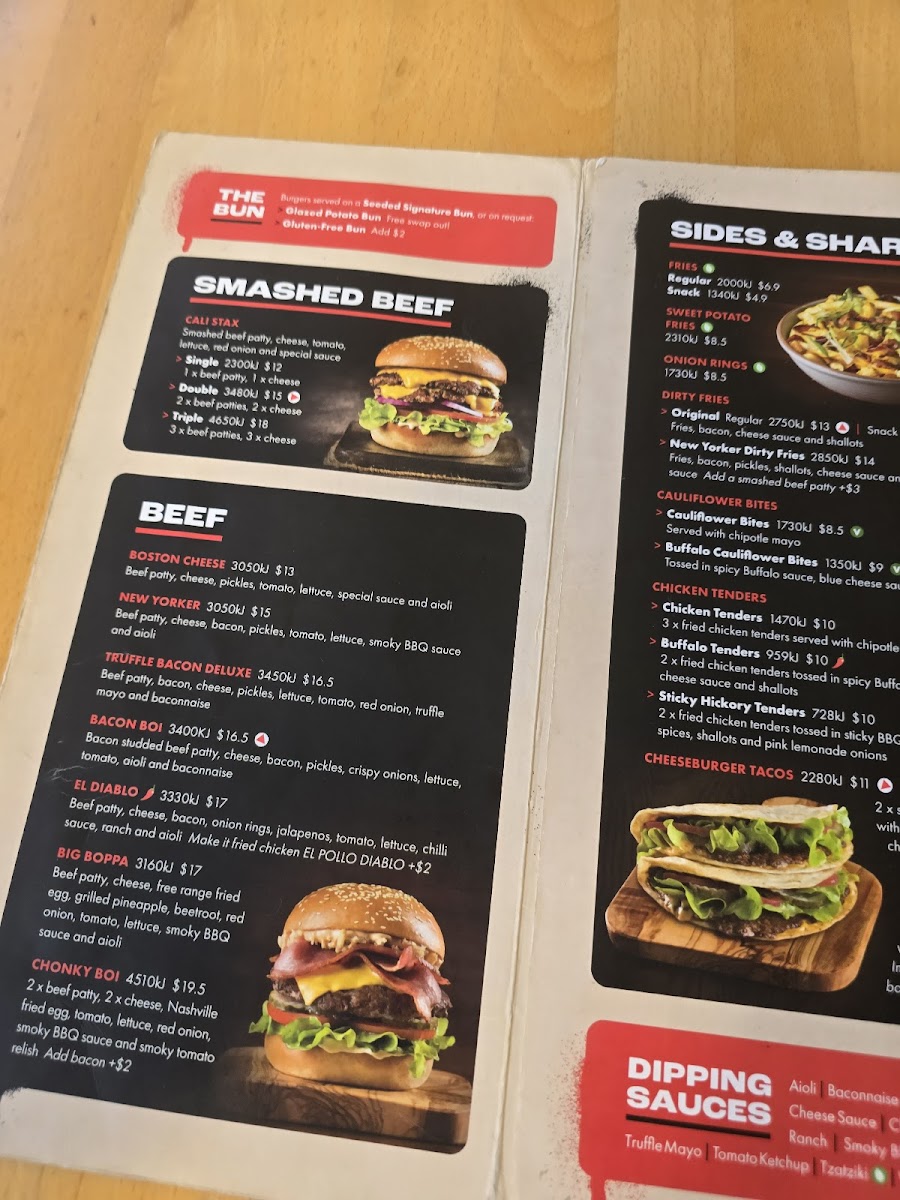 Introducing the menu at Burger Urge (DFO Brisbane Airport), a must-visit hamburger restaurant nestled at Brisbane Airport. This vibrant spot serves up a diverse range of mouthwatering options, perfect for any burger lover. Their signature SMASHED BEEF range features the iconic CALI STAX burgers available in single, double, or triple patties, all layered with melted cheese, fresh veggies, and a rich special sauce.